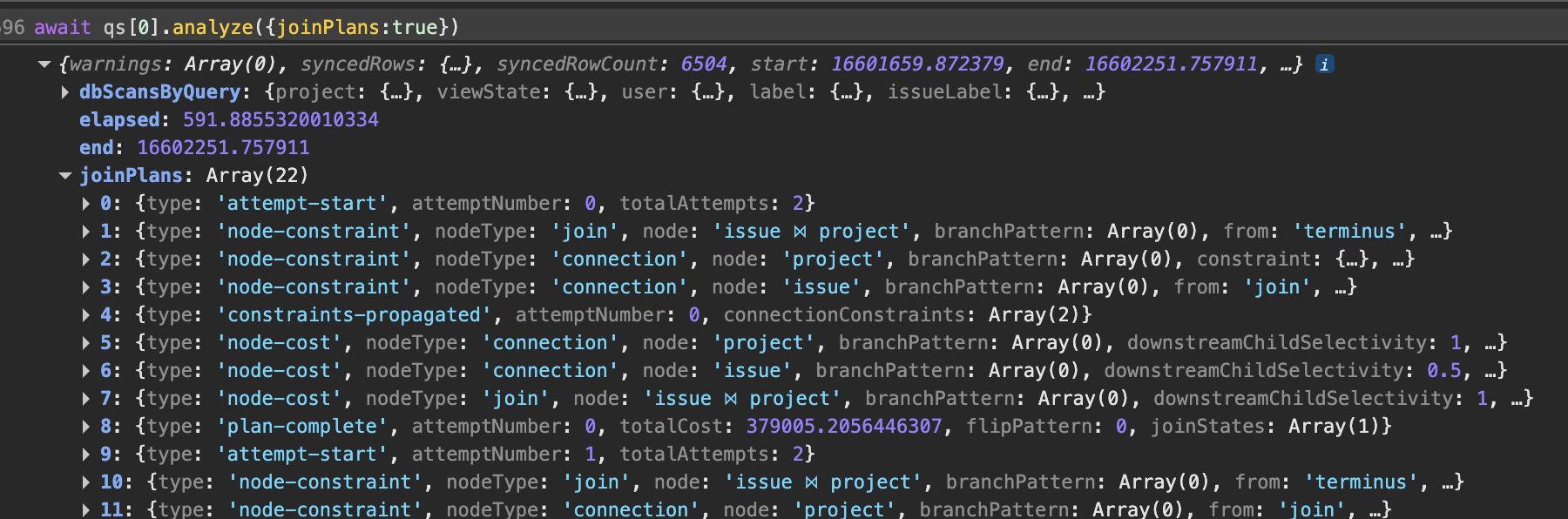 To view the join plan selected by Zero, call `analyze()` or `analyzeQuery()` with the `joinPlans` option set to true and see the `joinPlans` field in the output: